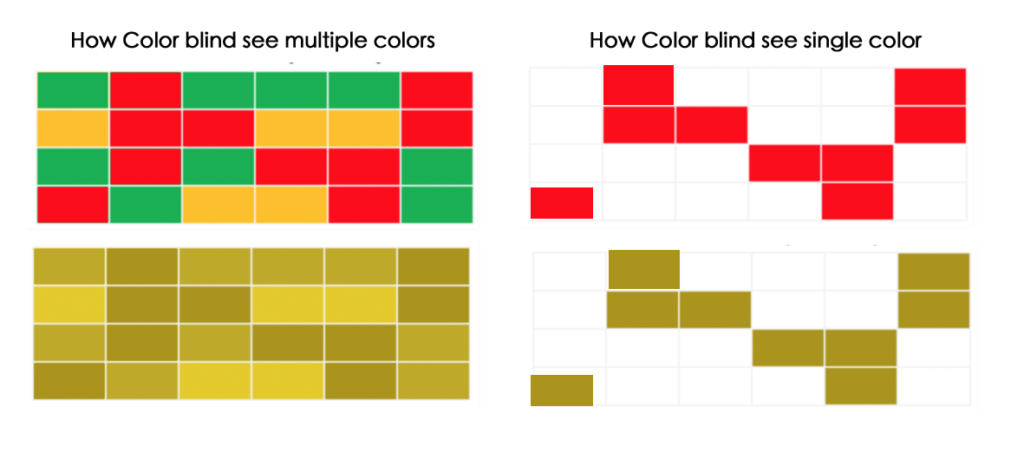 - D you like to use red, yellow, green(traffic light colors)? Think again! Did you know that 1 in 12 men (8%) and 1 in 200 women in the world are color blind? These colors will have minimum effect on them.